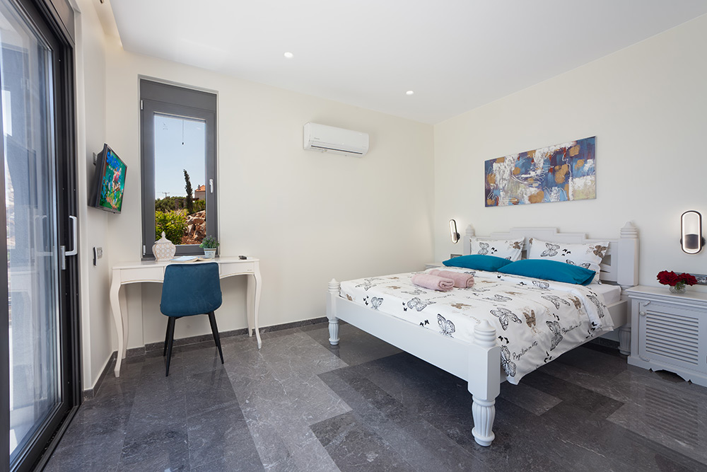 Lela villa has three bedrooms. One double with sea view on groundfloor, two with sea view on first floor (one double and one single). Villa also has two bathrooms one on each floor. All guests have free sun beds on the beach of Plaka opposite Spinalonga.